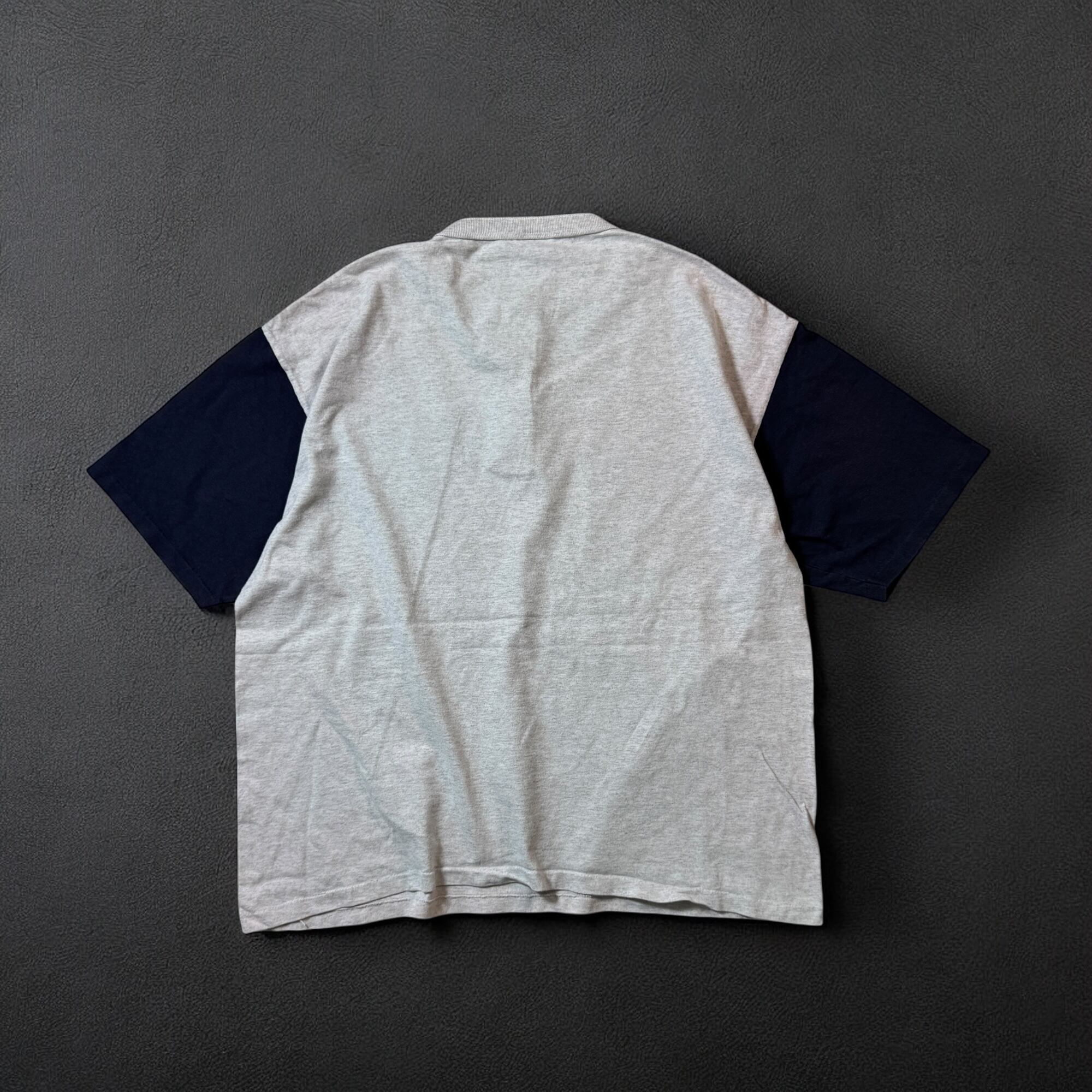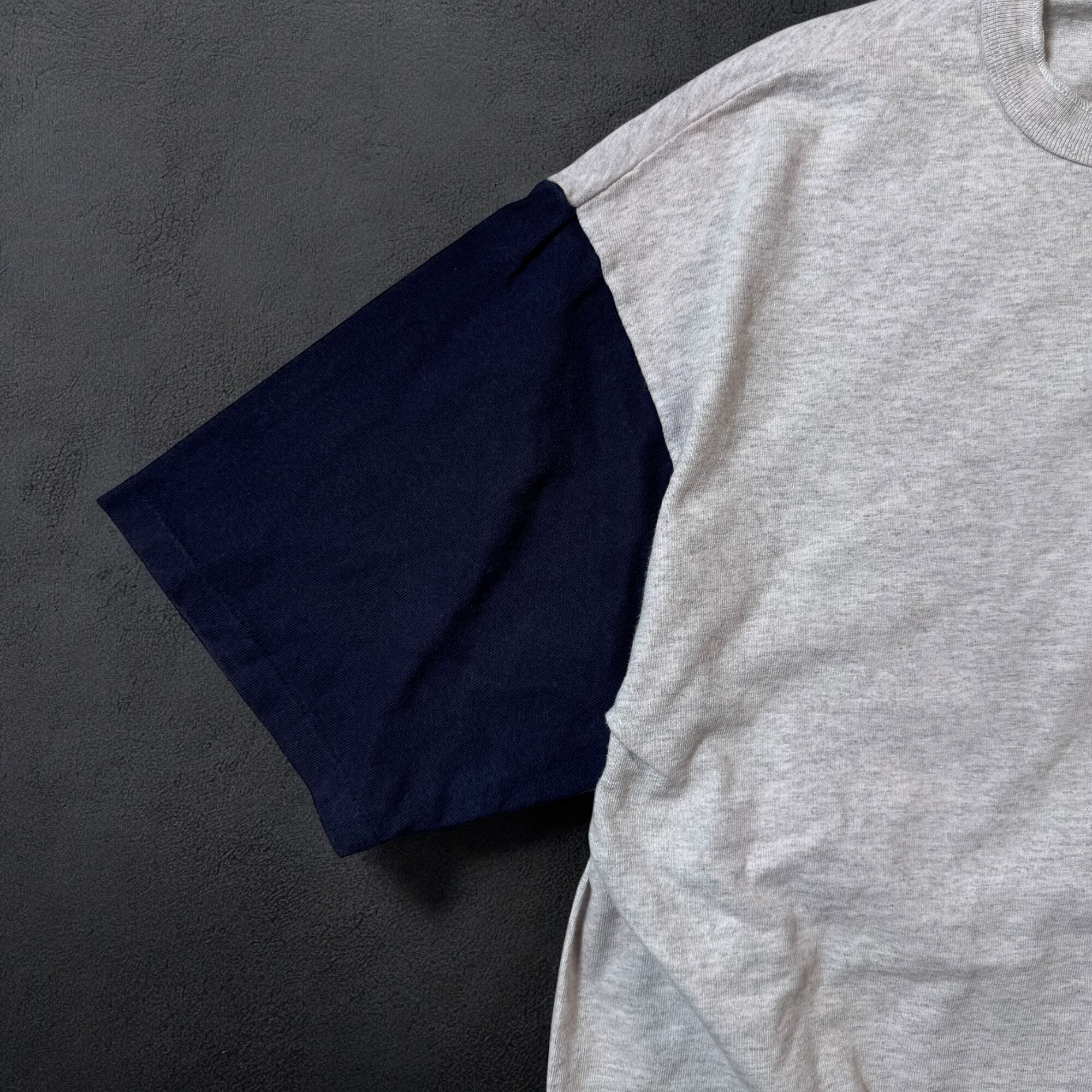 霜降りグレーに袖はネイビーのツートーン、ヘビーオンスの厚めの生地、ネックのボタンは柄ボタンとデザイン性も◎