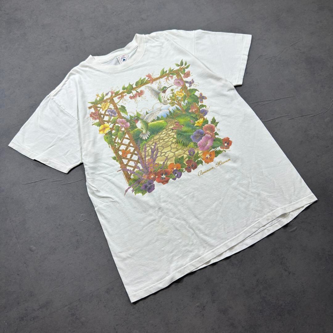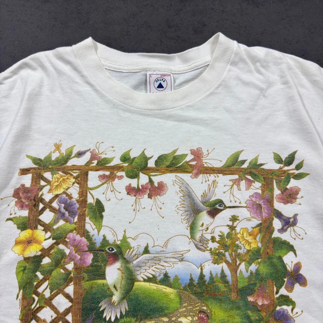 色鮮やかな花と2羽のハチドリが描かれたアートTシャツ