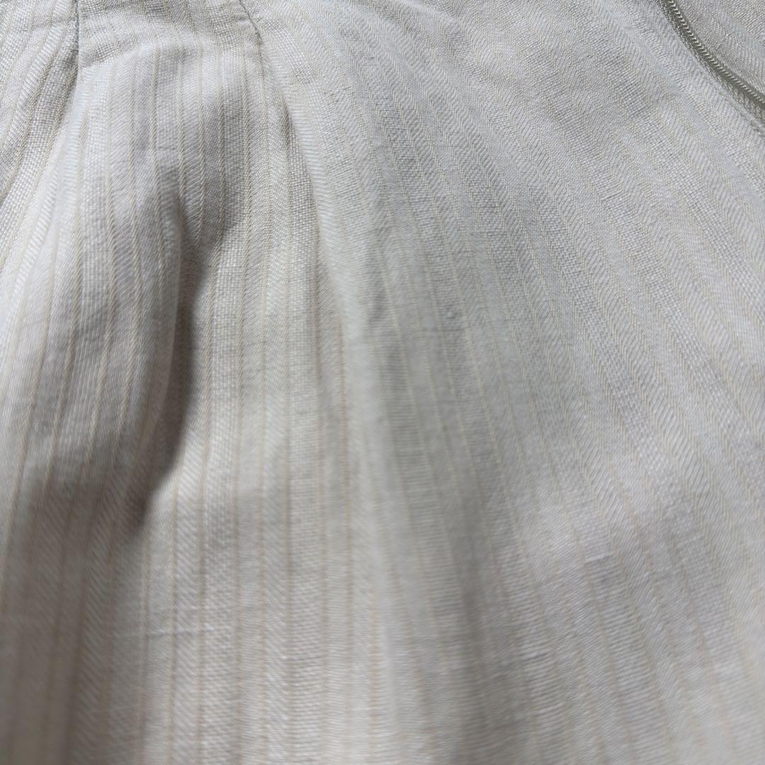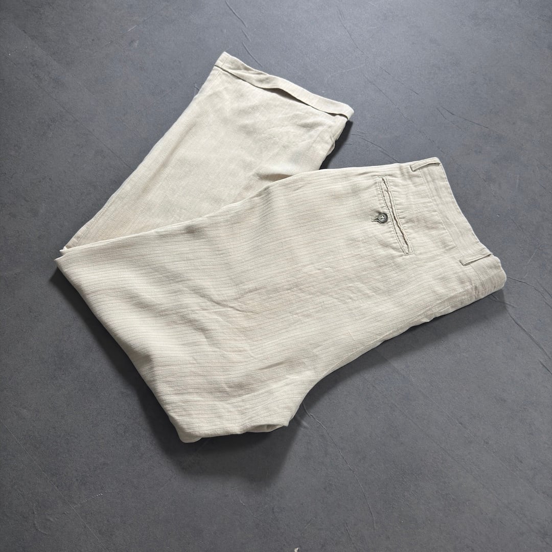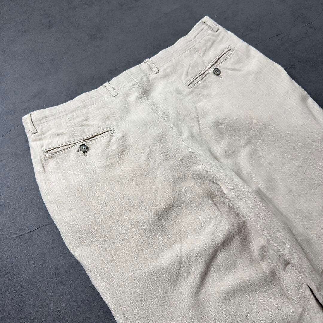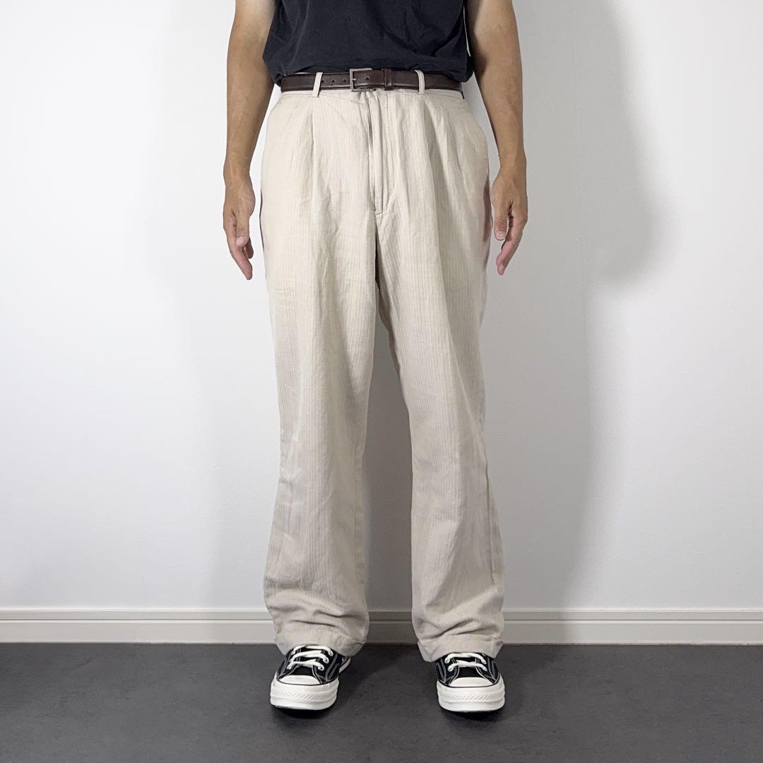 ツータックのリラックスシルエットにストライプのような織り模様に明るめのベージュ