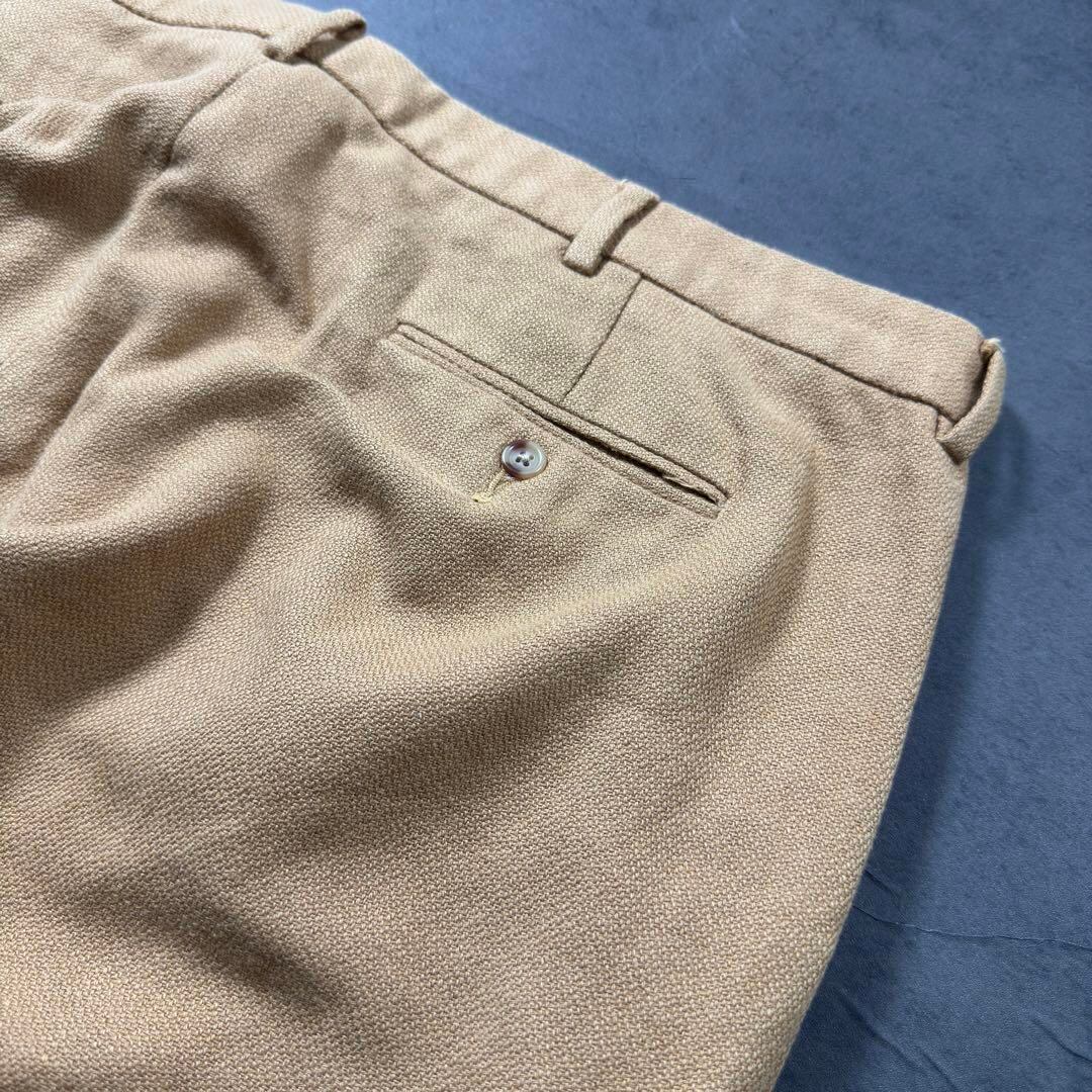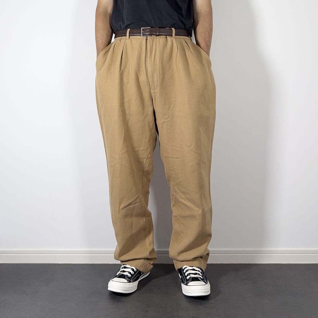 ウエスト42と大きいですが、ベルトでギュッと絞って穿くと丁寧に施されたタックと合わさってきれいなドレープが生まれリラックスしたシルエットに