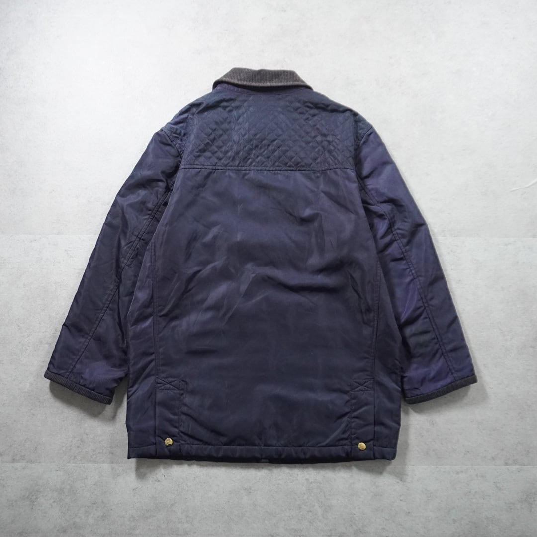 表地はナイロンで前見頃のポケットなどに菱形のステッチが施されていてキルティングジャケットのような一着