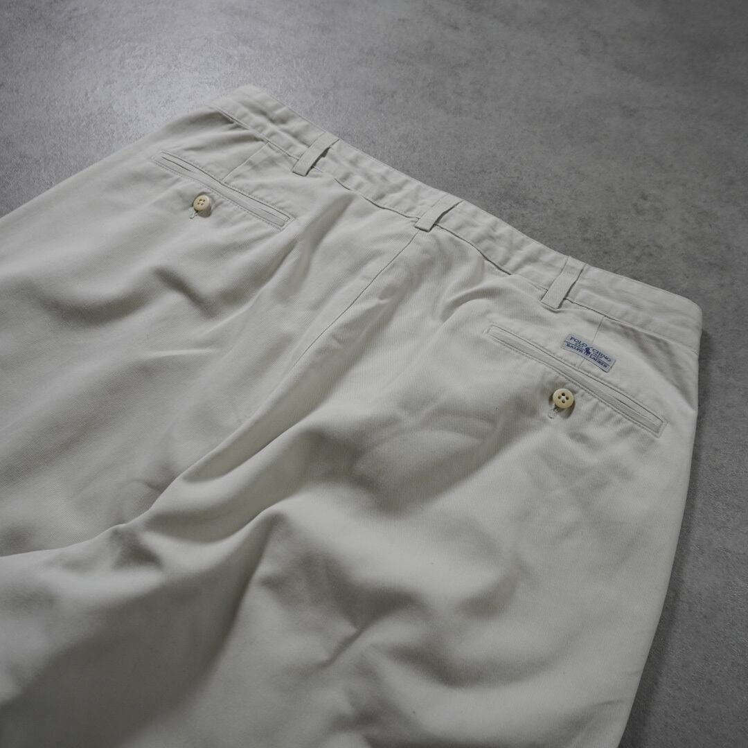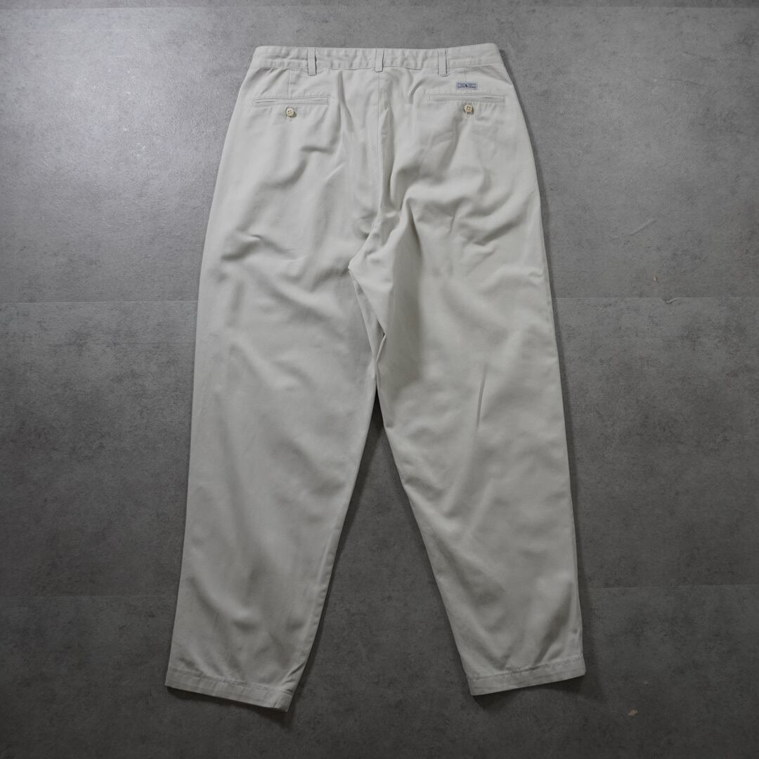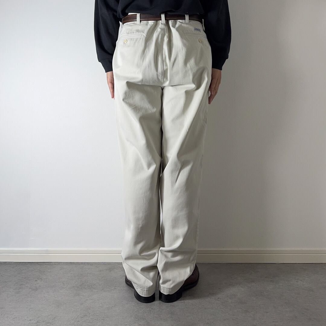 ウエストはツータック、裾にかけて、ゆるやかなテーパードがかかったキレイなシルエット、生地はガシッと目の詰まった風合いの良いチノクロス