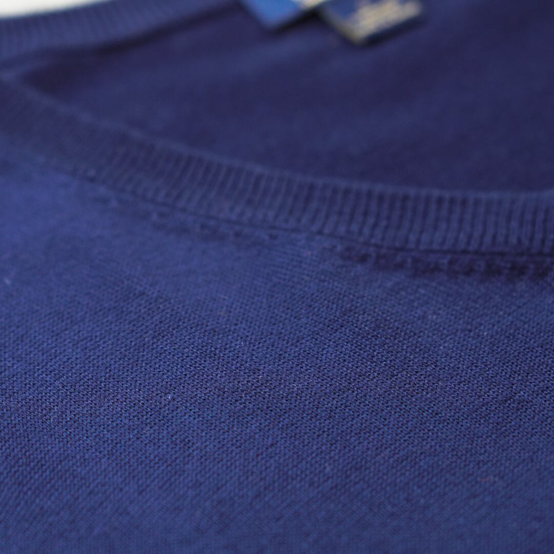 細かく密に編み込まれたハイゲージニットで生地は高級綿のスーピマコットンを使用、滑らかな表面感が非常に上品な印象の一着