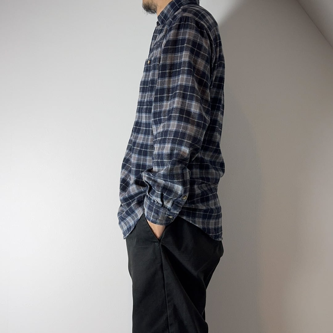 ネイビーとグレーを基調としたチェック柄のワークウェアらしい無骨さと、タウンユースにも馴染むクリーンな雰囲気もある一枚