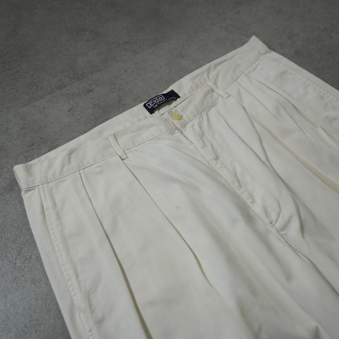 サイズ表記W40L32、実寸でW38.5L30相当、ウエストはやや大きめですが、ホワイトのパンツはベルトで絞ってしっかりワイドで穿くのもありかと思います