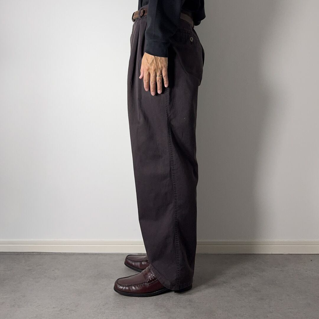 フロントに深く入った2タック、ゆったりした腰回りから裾にかけてテーパードの効いたシルエット