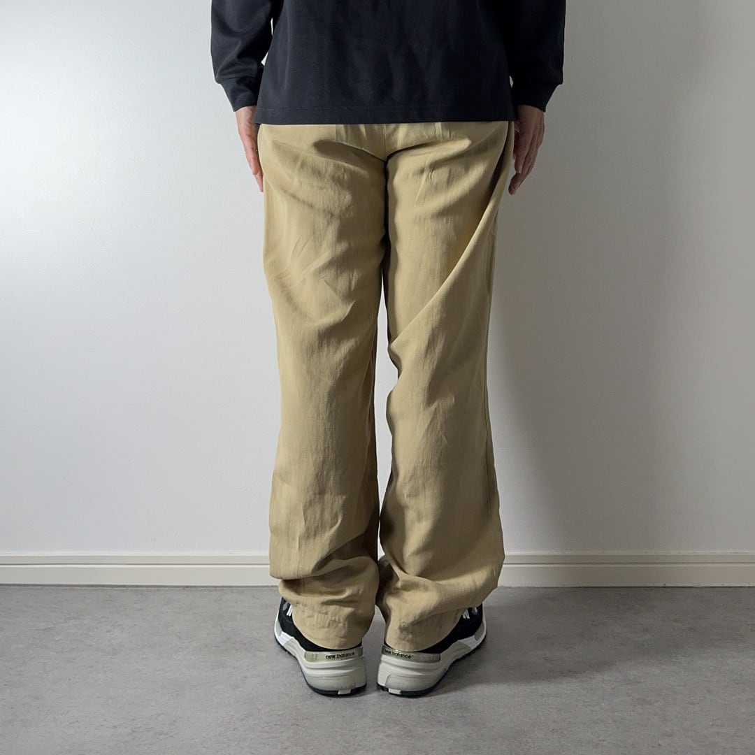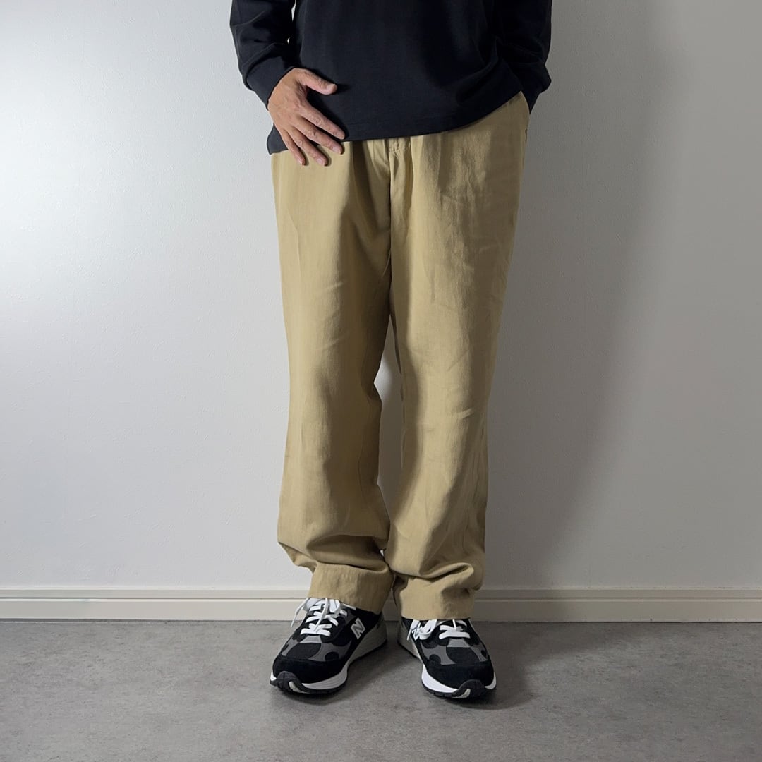 コインポケットやタックのないプレーンフロント仕様、股上深くゆったりとしたストレートはポロチノのフィリップパンツの様なディテールですが、やはりリネンシルクのストンと綺麗に落ちるシルエットやドレープ感はワンランク上の雰囲気があります