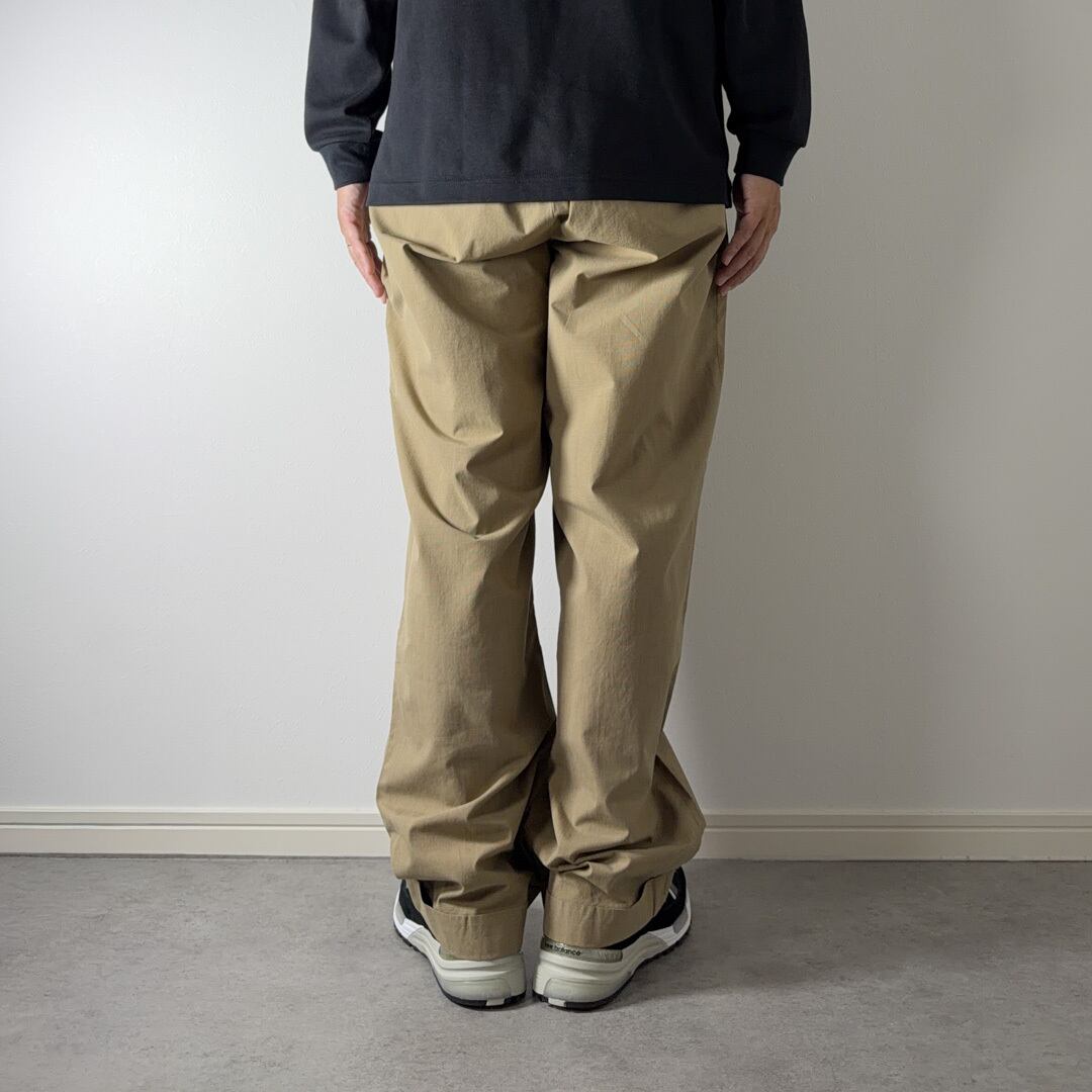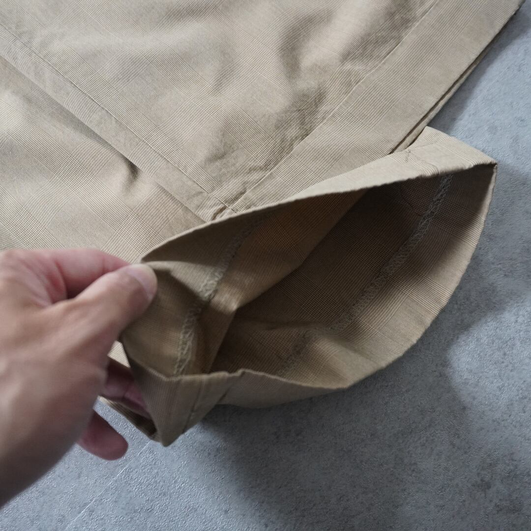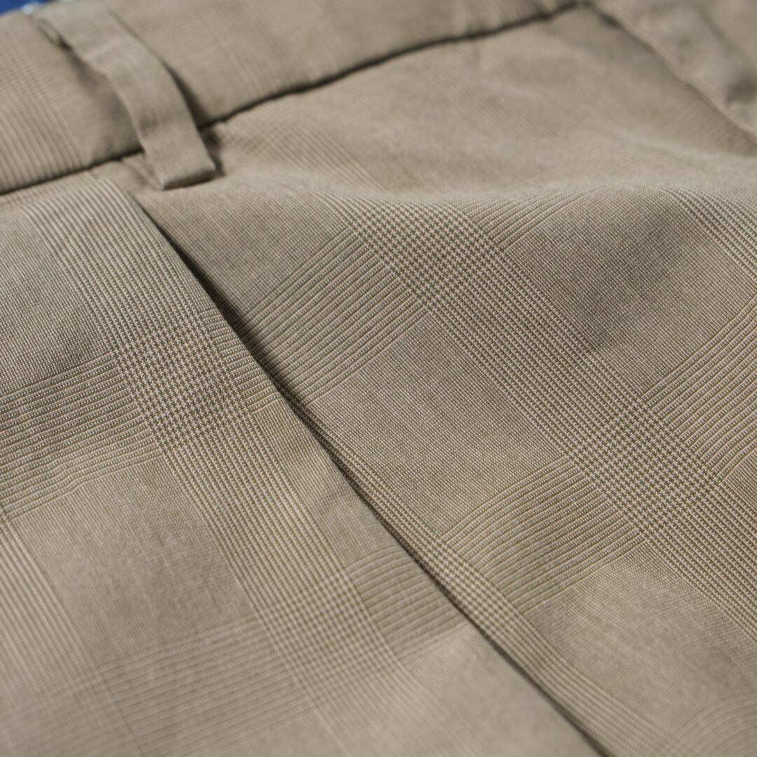 こちら遠目には「ベージュのパンツ」に見えますが、近づくと緻密なグレンチェック柄になっています