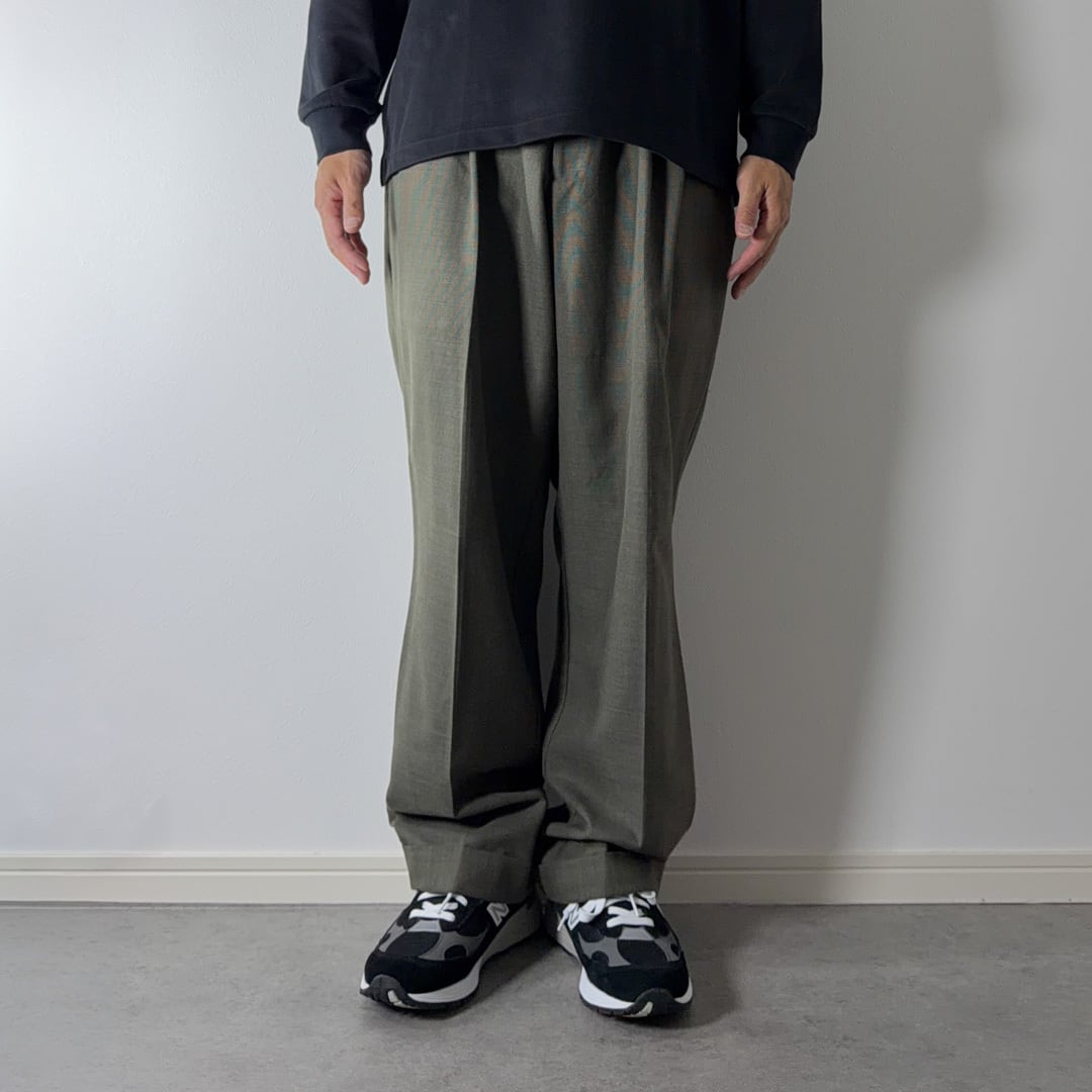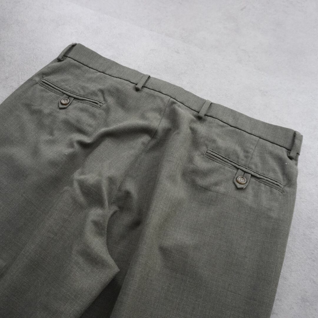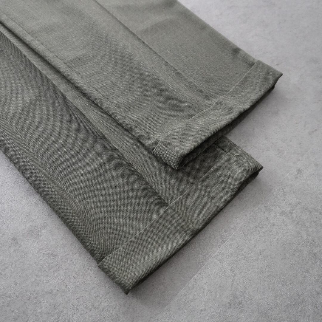 フロントに深く入った2タック、ゆったりした腰回りから裾にかけてテーパードの効いたシルエット、裾はダブルの仕立て